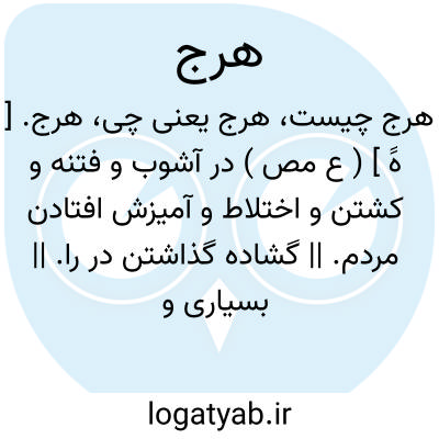 هرج. [ هََ ] ( ع مص ) در آشوب و فتنه و کشتن و اختلاط و آمیزش افتادن مردم. || گشاده گذاشتن در را. || بسیاری و فزونی نمودن در سخن. ( منتهی الارب )( اقرب الموارد ). بسیار گفتن. ( تاج المصادر بیهقی ) ( مصادر اللغة زوزنی ). || سخن شوریده و مشتبه گفتن. ( منتهی الارب ). تخلیط در سخن. ( از اقرب الموارد ). || گاییدن جاریه را. ( منتهی الارب ). || در مجامعت افراط کردن. ( مصادر اللغة زوزنی ). || به رفتار آمدن اسب و سرعت کردن. ( منتهی الارب ) ( اقرب الموارد ). || ( اِ ) افزونی در هر چیزی. ( منتهی الارب ). || آشوب و فتنه. ( منتهی الارب ) ( غیاث از صراح اللغة ). فتنه و اختلاط:هذا زمن الهرج. ( از اقرب الموارد ). || قتال و کشتار: بین یدی الساعة هرج. ( از اقرب الموارد ).