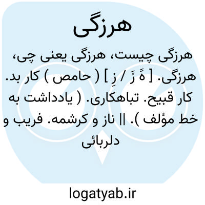 ۱- هرزه بودن تباهکاری. ۲- عیاشی: (( هرچه داشت دردوسهسال بخوشگذرانی و هرزگی تمام کرد. ) ) ۲- (اسم ) امرقبیح کابد. ۴- نازوکرشمه دلربایی: (( بدست بادچنین زلف خویش بادمده که هست پیش. اوهرزگی وغمازی. ) ) (همام ) ۵- آلت رجولیت: (( شلوارش پارهو هرزگیش پیدابود. ) )