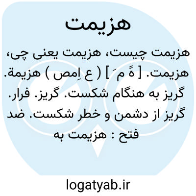 ۱- (مصدر ) شکست یافتن لشکروپراکندهشدن سپاهیان. ۲- (اسم ) شکست لشکر فرار سپاهیان: ((... عاروشنارهزیمت بی جنگ را بنام وننگ چندین سال. خویش راه داده... ) ) یا به هزیمت رفتن. فرارکردن: (( آنرا که چنین زخم ویال قوی باشد چگونه بهزیمت رود? ) ) یا پشت به هزیمت دادن. فرارکردن: (( وپشت بهزیمت دادبا آنکه غلبهای ازسواروپیادهداشت. ) )