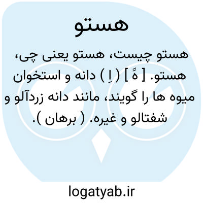هستو. [ هََ ] ( اِ ) دانه و استخوان میوه ها را گویند، مانند دانه زردآلو و شفتالو و غیره. ( برهان ). هسته. خستو. خسته. ( حاشیه برهان چ معین ). || حق و درستی و حقایق اشیاء. ( برهان ) ( جهانگیری ). || ( ص ) خستو. ( حاشیه برهان چ معین ). شخصی را نیز گویند که اقرار و اعتراف به چیزی کند. ( برهان ). مقر. معترف. خستو. ( یادداشت به خط مؤلف ):