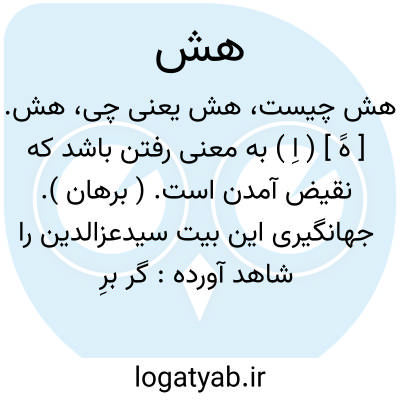 هش. [ هََ ] ( اِ ) به معنی رفتن باشد که نقیض آمدن است. ( برهان ). جهانگیری این بیت سیدعزالدین را شاهد آورده: