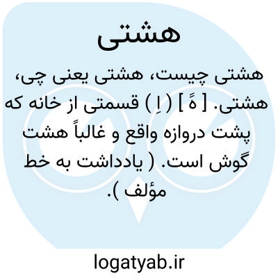 هشتی. [ هََ ] ( اِ ) قسمتی از خانه که پشت دروازه واقع و غالباً هشت گوش است. ( یادداشت به خط مؤلف ).