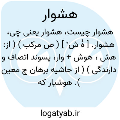 هشوار. [ هَُ ش ْ ] ( ص مرکب ) ( از: هش، هوش + وار، پسوند اتصاف و دارندگی ) ( از حاشیه برهان چ معین ). هوشیار که نقیض بیهوش باشد. ( برهان ). هشیار. هوشیار. ( حاشیه برهان چ معین ).