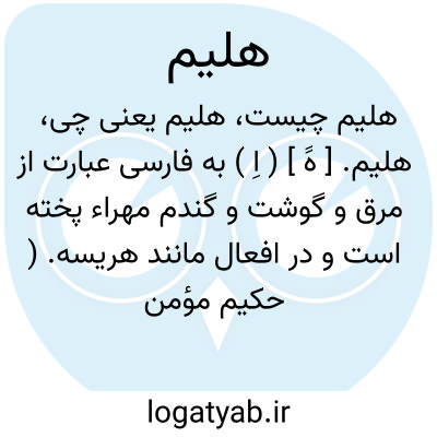 هلیم. [ هََ ] ( اِ ) به فارسی عبارت از مرق و گوشت و گندم مهراء پخته است و در افعال مانند هریسه. ( حکیم مؤمن ). خوراکی است که از بلغور و گوشت پزند و در ضمن پختن پیوسته به هم زنند تا لعاب گیرد و سپس بر آن روغن و گونه ای از ادویه معطر ( بیشتر دارچین ) ریزند.