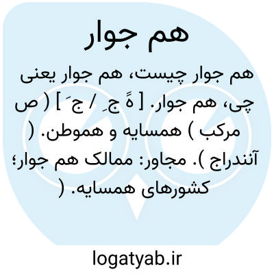 هم جوار. [ هََ ج ِ / ج َ ] ( ص مرکب ) همسایه و هموطن. ( آنندراج ). مجاور: ممالک هم جوار؛ کشورهای همسایه. ( یادداشت مؤلف ).