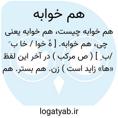 هم خوابه. [ هََ خوا / خا ب َ /ب ِ ] ( ص مرکب ) در آخر این لفظ «ها» زاید است ) زن. هم بستر. هم بالین. همسر. زوجه. ( آنندراج ):