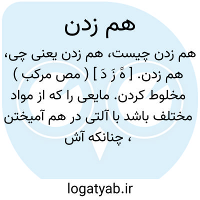 هم زدن. [ هََ زَ دَ ] ( مص مرکب ) مخلوط کردن. مایعی را که از مواد مختلف باشد با آلتی در هم آمیختن، چنانکه آش را با چمچه یا قاشق هم زنند. ( یادداشت مؤلف ).