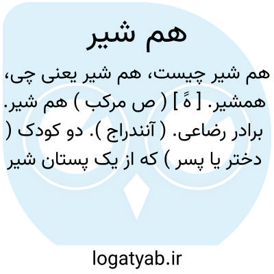همشیر. [ هََ ] ( ص مرکب ) هم شیر. برادر رضاعی. ( آنندراج ). دو کودک ( دختر یا پسر ) که از یک پستان شیر خورند. رضیع. رضیعة.