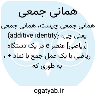 {additive identity} [ریاضی] عنصر e در یک دستگاه ریاضی با یک عمل جمع با نماد +، به طوری که برای هر عنصر x از آن دستگاه، e+x=x+e=x