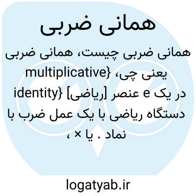 {multiplicative identity} [ریاضی] عنصر e در یک دستگاه ریاضی با یک عمل ضرب با نماد. یا ×، به طوری که برای هر عنصر x از آن دستگاه، e. x=x.e=x