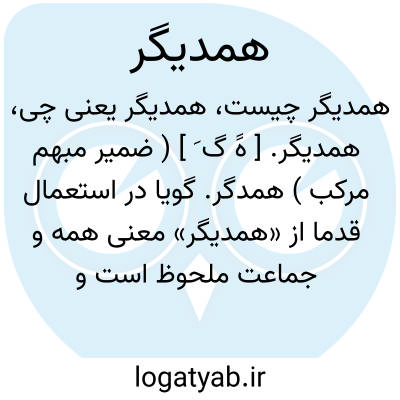 همدیگر. [ هََ گ َ ] ( ضمیر مبهم مرکب ) همدگر. گویا در استعمال قدما از «همدیگر» معنی همه و جماعت ملحوظ است و از یکدیگر از هر سو یک تن. ( یادداشت به خط مؤلف ). یکدیگر. رجوع به همدگر شود.