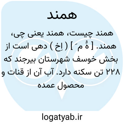 همند. [ هَُ م َ ] ( اِخ ) دهی است از بخش درمیان شهرستان بیرجند که هشت تن سکنه دارد. آب آن از قنات و محصول عمده اش غله است. ( از فرهنگ جغرافیائی ایران ج 9 ).