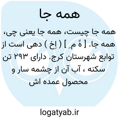 همه جا. [ هََ م ِ ] ( اِخ ) دهی است از توابع شهرستان کرج. دارای 293 تن سکنه، آب آن از چشمه سار و محصول عمده اش غله، لبنیات و عسل است. ( از فرهنگ جغرافیایی ایران ج 1 ).