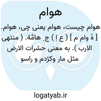 هوام. [ هََ وام م ] ( ع اِ ) ج ِ هامَّة. ( منتهی الارب ). به معنی حشرات الارض مثل مار وکژدم و راسو و مور و هر خزنده و گزنده است. ( غیاث ).در فارسی به تخفیف هم به کار رفته است: