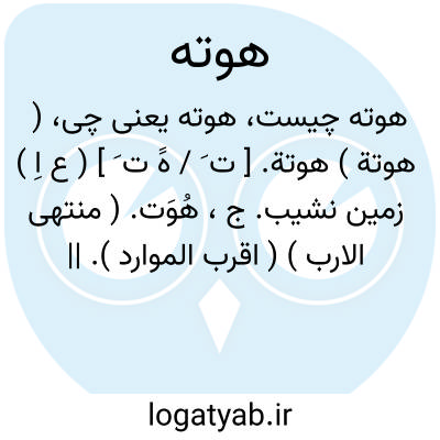 ( هوتة ) هوتة. [ ت َ / هََ ت َ ] ( ع اِ ) زمین نشیب. ج، هُوَت. ( منتهی الارب ) ( اقرب الموارد ). || راه سرازیر بسوی آب. ( اقرب الموارد ).
