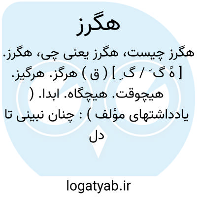 هرگز: (( الم ازدلها برگیرد وتابودههگرز بردل کس نهادست بیک موی الم. ) ) ( فرخی ) توضیح شمس قیس گوید: (( مسعوسعد گفتهاست:...درصحیح لغت دری ((هگرز ) ) نیست ومستعمل هرگز است. ) ) ولی چنانکهدیدهشددرپهلوی ((هکرچ ) ) آمده ودرادب فارسی اسم (هگرز ) ) مکرر آمدهاست.