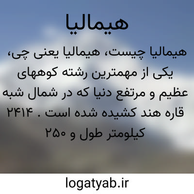 یکی از مهمترین رشته کوههای عظیم و مرتفع دنیا که در شمال شبه قاره هند کشیده شده است. ۲۴۱۴ کیلومتر طول و ۲۵٠ کیلومتر عرض دارد و در پاکستان کشمیر هند تبت چین نپال سیکیم و بهوتان کشیده شده که بنامهای هیمالیای بیرونی خوانده میشود بلندترین قله عالم یعنی قلهاورست که ۸۸۴۸ متر ارتفاع دارد جزئ هیمالیای بزرگ میباشد دامنه این کوهستان پرباران ترین نواحی عالم می باشد. سرچشمه رودهای پر آب و پهناور گنگ سند براهماپوترا که جلگه های حاصلخیز شمال شبه قاره هندوستان را آبیاری میکنند.