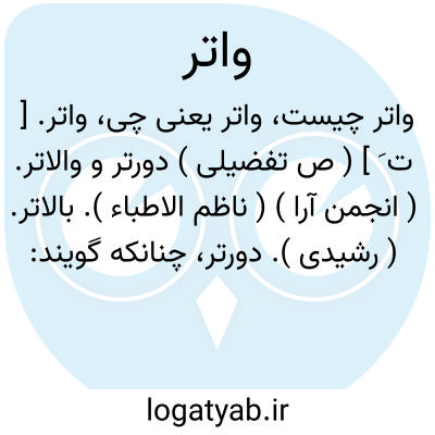 واتر. [ ت َ ] ( ص تفضیلی ) دورتر و والاتر. ( انجمن آرا ) ( ناظم الاطباء ). بالاتر. ( رشیدی ). دورتر، چنانکه گویند: پای واتر نهاد یعنی پا را دورتر گذاشت. ( برهان ) ( آنندراج ): ملحاح؛ آن شتر که از آبشخور واتر نیاید. ( السامی فی الاسامی ).