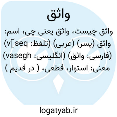 در حمله تست عروةالوثقی.( ؟ ).همی آمد تا از لمغان بگذشت واثق بحول و قوت خویش و مستظهر به کثرت سواد و غلبه حشم و اجناد.( ترجمه تاریخ یمینی ص 35 ). سوم نوبت به عادت سابق واثق و ایمن باشد و چون قصاب او را بگیرد و محکم ببندد بهیچگونه هراس و خوف بدو راه نیابد. ( ترجمه تاریخ یمینی ص 180 ). چون ابوالحارث این احوال بشنید به آن واثق شد و بر آن اعتمادکرد. ( ترجمه تاریخ یمینی ص 185 ). پادشاه را بر خیانت کسی واقف مگردان مگر آنکه بر صحت آن قول بکلی واثق باشی. ( گلستان ).