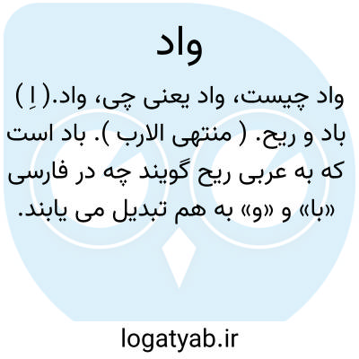 واد.( اِ ) باد و ریح. ( منتهی الارب ). باد است که به عربی ریح گویند چه در فارسی «با» و «و» به هم تبدیل می یابند. ( از برهان ) ( آنندراج ). || به معنی پسر هم آمده است که در مقابل دختر باشد. ( برهان ) ( آنندراج ) ( از ناظم الاطباء ) ( از انجمن آرا ). ولی این معنی به غلط استنباط شده است.