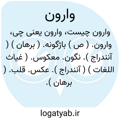 وارون. ( ص ) باژگونه. ( برهان ) ( آنندراج ). نگون. معکوس. ( غیاث اللغات ) ( آنندراج ). عکس. قلب. ( برهان ). وارن. وارونه. باژون. باژونه. واژون. واژونه. واژگون. واژگونه. باژگون. باژگونه. نگونسار. سرنگون. مقلوب. منکوس. سراگون. باشگونه. باشگون: