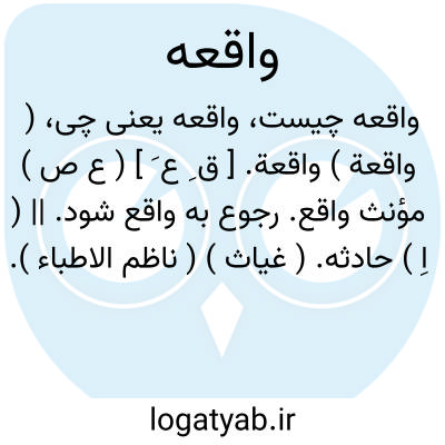 (اسم ) مونث واقع. ۱ - ( صفت ) پدید آینده رخ دهنده. ۲ - قرار دارنده: ((... مثل راه شوس. شهر شوش تاهمدان وراه شوس. واقعه در مملکت مازندران... ) ) ۴ - (اسم ) حادثه اتفاق پیشامد: (( الب ارسلان بعد از واقع. عم باستدعای ارکان دولت بعراق آمد. ) ) ۴ - حال وضع: (( بوقت عود سلطان حال او اعلام دادند بر واقع. او تنگدل شد. ) یا صورت واقعه. شرح حال شرح ما وقع:((... صورت واقع. اورا بگفتند. ) ) ۵ - شرح حال حسب حال: (( واقعه کوته کنم چه بگویم ازین بیش خامه که پیش اندرست راه درازیم. ) ) ۶ - مرگ موت فوت: (( بعد از چهار روز واقع. او فاش کردند ( یعنی وفات اتسز را ). ) ) ۷ - روز قیامت روز رستخیز. ۸ - خواب رویا: (( دوش در واقعه دیدم که نگاری می گفت سعدیا گوش مکن بر سخن اعدایت. ) ) (بدایع سعدی ) ۹ - امور غیبی که براهل خلوت آشکار شود و آن را - اگر در حال حضور باشد - مکاشفه گویند جمع ( عربی ) واقعات. بعضی از واقعات صادق و برخی کاذب باشد - بالجمله واقعه آن چیزیست که سالک در اثنائ ذکر بیند و در افنائ استغراق حالش با حق بیند بنحوی که محسوسات ازو غایب شود و آن مابین نوم و یقظه است.