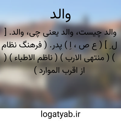 والد. [ ل ِ ] ( ع ص، اِ ) پدر. ( فرهنگ نظام ) ( منتهی الارب ) ( ناظم الاطباء ) ( از اقرب الموارد ) ( مهذب الاسماء ) ( المنجد ). بابا. اب. باب: