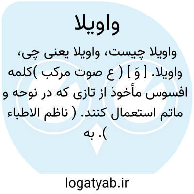 واویلا. [ وَ ] ( ع صوت مرکب )کلمه افسوس مأخوذ از تازی که در نوحه و ماتم استعمال کنند. ( ناظم الاطباء ). به معنی افسوس، چه لفظ وا کلمه ندبه است و ندبه به ضم به معنی نوحه ماتم و ویل به معنی افسوس و اندوه و در آخر الف برای مد صوت که در حالت ندبه در آخر الفاظ پیدا می کنند. ( غیاث اللغات ) ( آنندراج ). ای وای ! دریغا! حسرتا!: