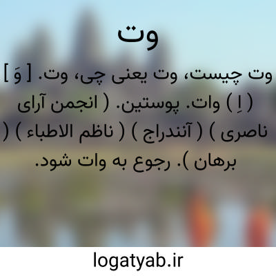 وت. [ وَ ] ( اِ ) وات. پوستین. ( انجمن آرای ناصری ) ( آنندراج ) ( ناظم الاطباء ) ( برهان ). رجوع به وات شود. || لباس پوستی. || سخن و وات و کلام. ( ناظم الاطباء ).