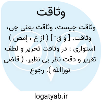 لغت نامه دهخدا وثاقت. [ وَ ق َ ] ( از ع، اِمص ) استواری: در وثاقت تحریر و لطف تقریر و دقت نظر بی نظیر. ( قاضی نوراﷲ ). رجوع به وثاقة شود.وثاقة. [ وَ ق َ ] ( ع مص ) استوار شدن. ( ترجمان علامه جرجانی ترتیب عادل بن علی ) ( تاج المصادر ). استوار گردیدن. ( از منتهی الارب ) ( اقرب الموارد ) ( آنندراج ). || استوارکاری نمودن. ( منتهی الارب ) ( آنندراج ) ( ناظم الاطباء ).