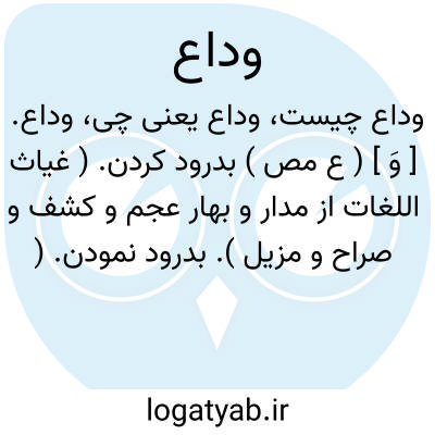 ۱ - ( اسم ) بدرود گویی خدا حافظی. ۲ - ( اسم ) بدرود: درروی او بخندید از بهر حال کو خود بر آفتاب خندد وقت وداع هرمه. ( سنائی ) ۳ - ( اسم ) وداع باد ترا. خداحافظ.: گفت:ای یاران. روان گشتم وداع سوی آن صدری که میراست و مطاع. ( مثنوی ) توضیح وداع که اغلب بکسر واو تلفظ کنند دراصل بفتح واو است که باسم مصدر تودیع باشد