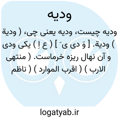 ودیه. [ وُدْ دی ی َ ] ( ع اِ ) زوجه. زن. ( فرهنگ فارسی معین ): معبر گفت که در همین حلال تو نهال جمال بشکفد و شجره ودیه تو به ثمره ولادت مثمر گردد. ( فرهنگ فارسی معین از روضة العقول، مقدمه مرزبان نامه ).