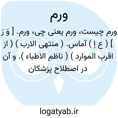 ( اسم ) بر آمدگی انساج نرم و یا استخوانی بدن خواه با التهاب همراه باشد ویابدون التهاب باشد تورم بر آمدگی. توضیح در تداول عام بهرنوع بر آمدگی نسجی که مربوط بهر عارضه ای باشد بطور عام این کلمه اطلاق میشود. یا ورم بیضه. التهاب و تورم بیضه ها را گویند غالبا در دنبال. یک سوزاک مزمن این عارضه پدید می آید. یا ورم پستان. التهاب وتورم پستان در اثر عفونت حاد یامزممن ورم تدی. یا ورم پلک. عارض. عفونی همراه با تورم مزمن درحول پلک ها خصوصا درناحی. ریش. مژه های پم بلعاریت. ورم جفن. یا ورم تدی. ورم پستان. یا ورم جرم دماغ.التهاب و تورم حادانساج مختلف. دماغ را گویند. آنسفالیت قرانیطس. یا ورم چشم. در دو ناراحیت انساج اصلی و انساج محافظ چشم همراه با التهاب و قرمزی قرنیه رمد.یا ورم چشم شرکی. عبارت از تحریکات ورمی چشم سالمی است که در تعقیب ضربه یا ورم چشم دیگر پیدا میشود ورد اصطلاح طب چشم تازه مبتلاشده را چشم تحریک شده و چشمی راکه در پیش مبتلابوده است چشم تحریک کننده گویند رمد شرکی. یا ورم حجاب حاجز. التهاب و تورم حجاب حاجز را گویند برسام. یا ورم حلق با غشائ کاذب. دیفتری.یا ورم حلقوم. لارنژیت. یا ورم راس حشفه. التهاب و تورم عفونی راس آلت را گویند و بیشتر در مواقعی عارض میشود که عمل ختنه انجام نشده باشد. یا ورم روده. التهاب و تورم روده را گویند. ورم معائ. یا ورم صفاق. التهاب و عفونت صفاق.یا ورم قرنیه. التهاب و تورم قرنی. چشم را گویند که فوق العاده خطرناک برای بینائی است و دید چشم را از بین میبرد کراتیت. یا ورم قولون. کولیت. یا ورم لوزتین. عفونت والتهاب لوزه ها را گویند. یا ورم معائ ورم روه. یاورم ملتحمه. التهاب و تورم انساج حول چشم.( پلک ها ) همراه بااتساع شبک. موی رگی قرنیه از اینجهت قرنیه در این عارضه قرمز رنگ بنظر می آید ورم ملتحمه ممکنست ویروسی و یا میکروبی و یا در اثر حساسیت باشد. یا ورم ملتحم. فصلی. ورم ملتحم. بهاری. یا ورم ملتحم. بهاری. ورم ملتحمه ای که در اثر حساسیت ببرخی عوامل در فصول معین غالبا بین پسر بچه ها دیده میشود و معمولا مسری نیست. بهترین راه معالج. انیگونه ورم ملتحمه ضدعفونی چشم با مواد دارویی ضعیف و استعمال داروهای ضد حساسیت است ورم ملتحم. فصلی. از علایم اصلی ورم ملتحمه ترشح مقادیر زیاد مواد چرکی است از پلکها که بصورت تود. سفید و یا مایل بزرد کمی چسبیده و خمیری شکل ترشح میشود ومعمولا تعدادش بقدری زیاد است که در موقع خواب ( شب ها ) موجب میشود پلک ها بهم بچسبند و در موقع بیداری پلک ها بزحمت زیاد از هم باز میشوند. یا ورم نقرسی زانو. نقرس. یا ورم اغشی. دماغ و نخاع. مننژیت.