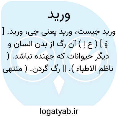 ورید. [ وَ ] ( ع اِ ) آن رگ از بدن انسان و دیگر حیوانات که جهنده نباشد. ( ناظم الاطباء ). || رگ گردن. ( منتهی الارب ) ( اقرب الموارد ) ( ناظم الاطباء ). ج، اَورِدَة، ورود. ( ناظم الاطباء ) ( منتهی الارب ) ( اقرب الموارد ). وُرُد. ( اقرب الموارد ). هر رگ که از جگر رسته است. ( ذخیره خوارزمشاهی ). رگ گردن و به آن حبل الورید نیز گویند. ( المنجد ) ( ناظم الاطباء ).