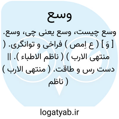 (اسم ) ۱- فراخی. ۲- توانگری. ۳- (اسم ) طاقت توانایی: (( ومرد دانا هرچندکه دولت رامساعددشمن بیند از کوشش در مقاومت بقدر وسع خویش کم نکند... ) ) یا دروسع وامکان. در قدرت و توانایی: (( برهمن گفت: آتچه در وسع وامکان بود در جواب و سوال با ملک تقدیم داشتم.یاوسع طاقت. بانداز. طاقت: اگر از این باب میسر تواند گشت و بوسع طاقت و قدرامکان در آن معنی رضاافتد صلح قرار دهیم.