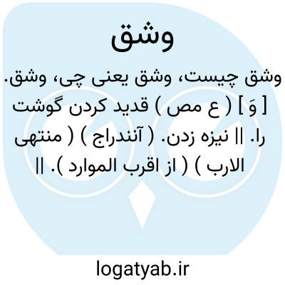 وشق. [ وَ ] ( ع مص ) قدید کردن گوشت را. || نیزه زدن. ( آنندراج ) ( منتهی الارب ) ( از اقرب الموارد ). || شتافتن. ( منتهی الارب ) ( آنندراج ) ( ناظم الاطباء ) ( اقرب الموارد ). || ( اِ ) چراگاه متفرق و پراکنده. ( منتهی الارب ) ( آنندراج ) ( ناظم الاطباء ).