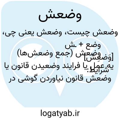 یه عمل یا فرایند وضعیدن قانون یا شرایط: وضعش قانون نیاوردن گوشی در مدرسه خوب نبود؛ بهتر بود از چند هفته پیش اطلاع رسانی میشد تا دانشآموزان آمادهتر میشدند. دوستان، بنظرتان بهترین وضعش (شکل/فرایند برای وضعیدن) سیاست نگهداری اطلاعات چگونه است؟