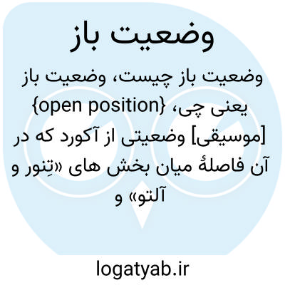 {open position} [موسیقی] وضعیتی از آکورد که در آن فاصلۀ میان بخش های «تِنور و آلتو» و «آلتو و سوپرانو» پنجم یا ششم باشند