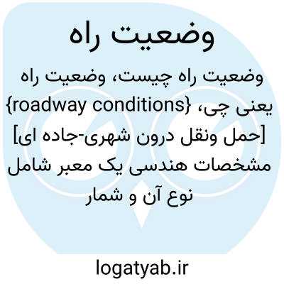 {roadway conditions} [حمل ونقل درون شهری-جاده ای] مشخصات هندسی یک معبر شامل نوع آن و شمار خطوط عبور و پهنای آنها در دو جهت و عرض شانه و سرعت درنظرگرفته شده در طراحی و مسیربندی افقی و عمودی