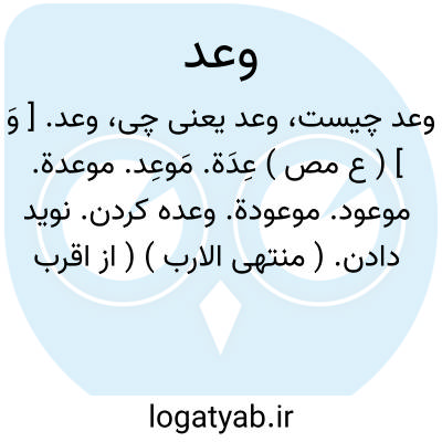 وعد. [ وَ ] ( ع مص ) عِدَة. مَوعِد. موعدة. موعود. موعودة. وعده کردن. نوید دادن. ( منتهی الارب ) ( از اقرب الموارد ) ( ترجمان علامه جرجانی ترتیب عادل ). در خیر و شر استعمال شود.( منتهی الارب ). گویند: وعد الامر و به خیراً و شراً وهرگاه خیر و شر را اسقاط کنند در مورد خیر وعد به کار برند و در مورد شر ایعاد. ( از اقرب الموارد ) ( ناظم الاطباء ) ( از منتهی الارب ). || چیره شدن در بسیاری ِ وعده. ( آنندراج ) ( منتهی الارب ) ( ناظم الاطباء ). || پذیرفتن. ( یادداشت مرحوم دهخدا ).