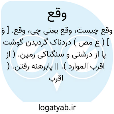 وقع. [ وَ ] ( ع مص ) دردناک گردیدن گوشت پا از درشتی و سنگناکی زمین. ( از اقرب الموارد ). || پابرهنه رفتن. ( اقرب الموارد ). شتاب رفتن. ( منتهی الارب ) ( آنندراج ) ( اقرب الموارد ). || وقوع. سقوط کردن. ( از اقرب الموارد ). افتادن. || سخن درانداختن از هر جنس. ( منتهی الارب ) ( آنندراج ). || تیز کردن مردم را به سخن. ( منتهی الارب ) ( آنندراج ) ( اقرب الموارد ). || مبالغه کردن در قتال دشمن. ( اقرب الموارد ). || پاره پاره کردن سنگ کرانه سم را. ( منتهی الارب ) ( آنندراج ) ( اقرب الموارد ). || نازل شدن باران. ( اقرب الموارد ). || ( اِ ) آسیب زدگی چیزی به چیزی. ( منتهی الارب ) ( آنندراج ) ( اقرب الموارد ). || جای بلند از کوه. ( اقرب الموارد ) ( منتهی الارب ) ( غیاث اللغات ) ( آنندراج ). || ابر که در آن امید باران باشد، یا ابر تنک. ( منتهی الارب ) ( آنندراج ) ( اقرب الموارد ). || ریگ ریزه. ( از اقرب الموارد ). || مجازاً اعتبار و عزت. ( غیاث اللغات ) ( آنندراج ). قدر و منزلت. ( اقرب الموارد ):
