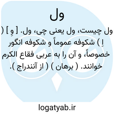 ول. [ وِ ] ( اِ ) شکوفه عموماً و شکوفه انگور خصوصاً، و آن را به عربی فقاع الکرم خوانند. ( برهان ) ( از آنندراج ). || گل. ( انجمن آرا از مجمع الفرس ) ( آنندراج ). وُل در لهجه ها به معنی گل آمده: