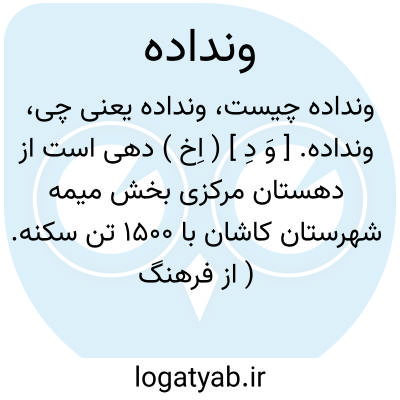 ونداده. [ وَ دِ ] ( اِخ ) دهی است از دهستان مرکزی بخش میمه شهرستان کاشان با 1500 تن سکنه. ( از فرهنگ جغرافیایی ایران ج 3 ).