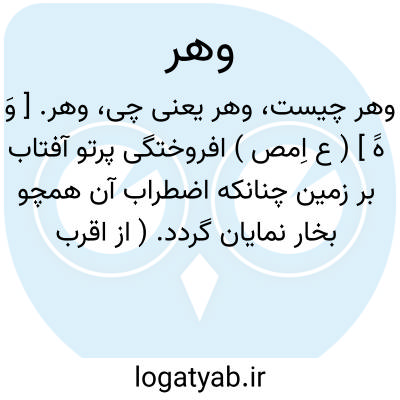 وهر. [ وَ هََ ] ( ع اِمص ) افروختگی پرتو آفتاب بر زمین چنانکه اضطراب آن همچو بخار نمایان گردد. ( از اقرب الموارد ) ( منتهی الارب ) ( آنندراج ).