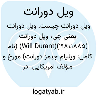 (نام کامل: ویلیام جیمز دورانت) مورخ و مـؤلف امریکایی. در ۱۹۱۷ با نوشتن پایان نامۀ خود فلسفه و مسئلۀ اجتماعی، از دانشگاه کلمبیا دانشنامۀ دکتری گرفت. در ۱۹۲۶ تاریخ فلسفه را منتشر کرد که با اقبال بی سابقه ای روبه رو شد و میلیون ها نسخه از آن به فروش رسید و نخستین اثر او بود که توسط عباس زریاب خویی به فارسی ترجمه شد. به دنبال آن کتاب لذات فلسفه را نوشت. این کتاب نیز توسط همو به فارسی ترجمه شد. مهم ترین اثر او تاریخ تمدن، در ۱۱ جلد (۱۹۳۵ـ۱۹۷۵) است، که جلد ۷ تا ۱۱ آن را با همکاری همسرش آریل دورانت (با نام اصلی ایدا کوفمان ۱۸۹۸ـ۱۹۸۱) نوشت. تاریخ تمدن کاری سترگ است که تاریخ جوامع بشری را از دوران های پیش از تاریخ تا قرن ۱۹م دربرمی گیرد. دهمین جلد این اثر، روسو و انقلاب (۱۹۶۷) جایزۀ پولیتزر را نصیب این زن و شوهر ساخت. آثار دیگر او عبارت اند از: دو زندگی نامه (در شرح احوال او و همسرش)؛ تفسیرهای زندگی و تفسیر تاریخ که به فارسی ترجمه شده و از استقبال خوبی در میان فارسی زبانان برخوردار بوده اند. ویل دورانت در ۱۳۲۷ش از ایران دیدن کرد.