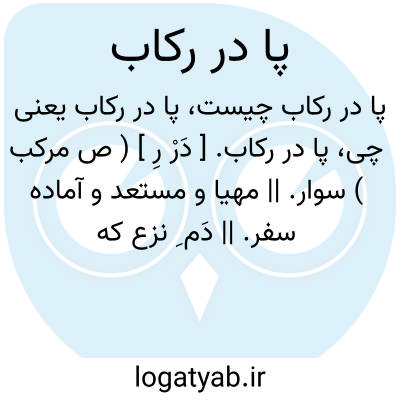 پا در رکاب. [ دَرْ رِ ] ( ص مرکب ) سوار. || مهیا و مستعد و آماده سفر. || دَم ِ نزع که ابتدای سفر آخرت است. ( برهان ). محتضر. || هر چیز که نزدیک به ضایع شدن باشد عموماًو شرابی که مایل بترشی شده باشد خصوصاً. ( برهان ).
