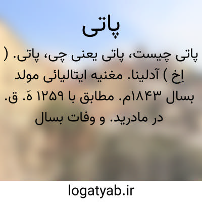 پاتی. ( اِخ ) آدلینا. مغنیه ایتالیائی مولد بسال 1843م. مطابق با 1259 هَ. ق. در مادرید. و وفات بسال 1919م. مطابق با 1338 هَ. ق..