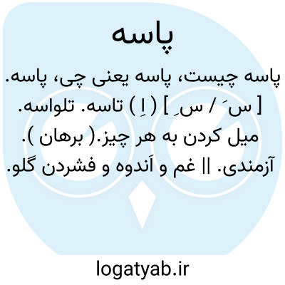 پاسه. [ س َ / س ِ ] ( اِ ) تاسه. تلواسه. میل کردن به هر چیز.( برهان ). آزمندی. || غم و اَندوه و فشردن گلو. ( برهان ). و ظاهراً این صورت مصحف تاسه باشد.