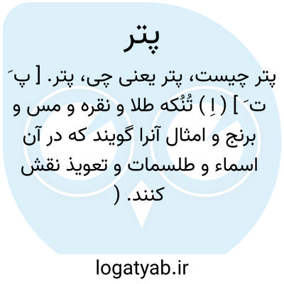 پتر. [ پ َ ت َ ] ( اِ ) تُنُکه طلا و نقره و مس و برنج و امثال آنرا گویند که در آن اسماء و طلسمات و تعویذ نقش کنند. ( برهان ). این کلمه هندی است. ( رشیدی ). و صاحب غیاث اللغات گوید پتر به فتحتین پاره های آهن پهن کرده شده و این لفظ مشترک است در هندی و فارسی مگر در هندی تاء فوقانی را مشدد آورند: