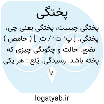 پختگی. [ پ ُ ت َ / ت ِ ] ( حامص ) نضج. حالت و چگونگی چیزی که پخته باشد. رسیدگی. یَنع: